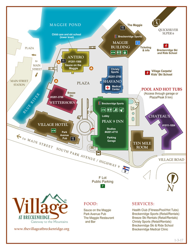 Rooms 1201-1506. The “Village Children’s ski school check in is on the lower level and Rocket Fizz Candy shop and the Sauce Restaurant is on the Plaza Level. Closest garage access is the yellow section.